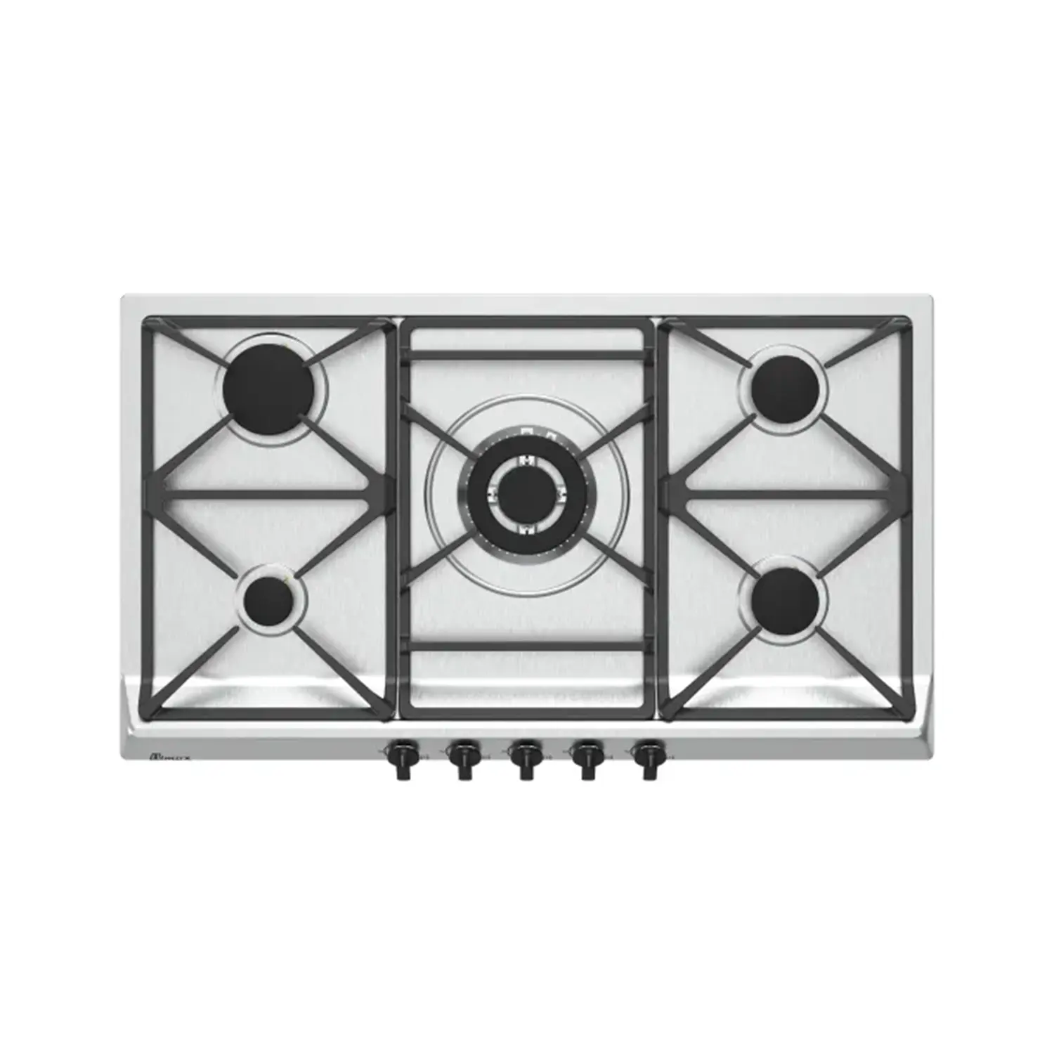 اجاق گاز استیل بیمکث کد 5077 یک مدل توکار پنج شعله با نمای استیل است که با طراحی مدرن و رعایت کامل استانداردهای ایمنی تولید شده و برای آشپزخانه‌هایی با فضای پخت‌وپز گسترده مناسب است.
